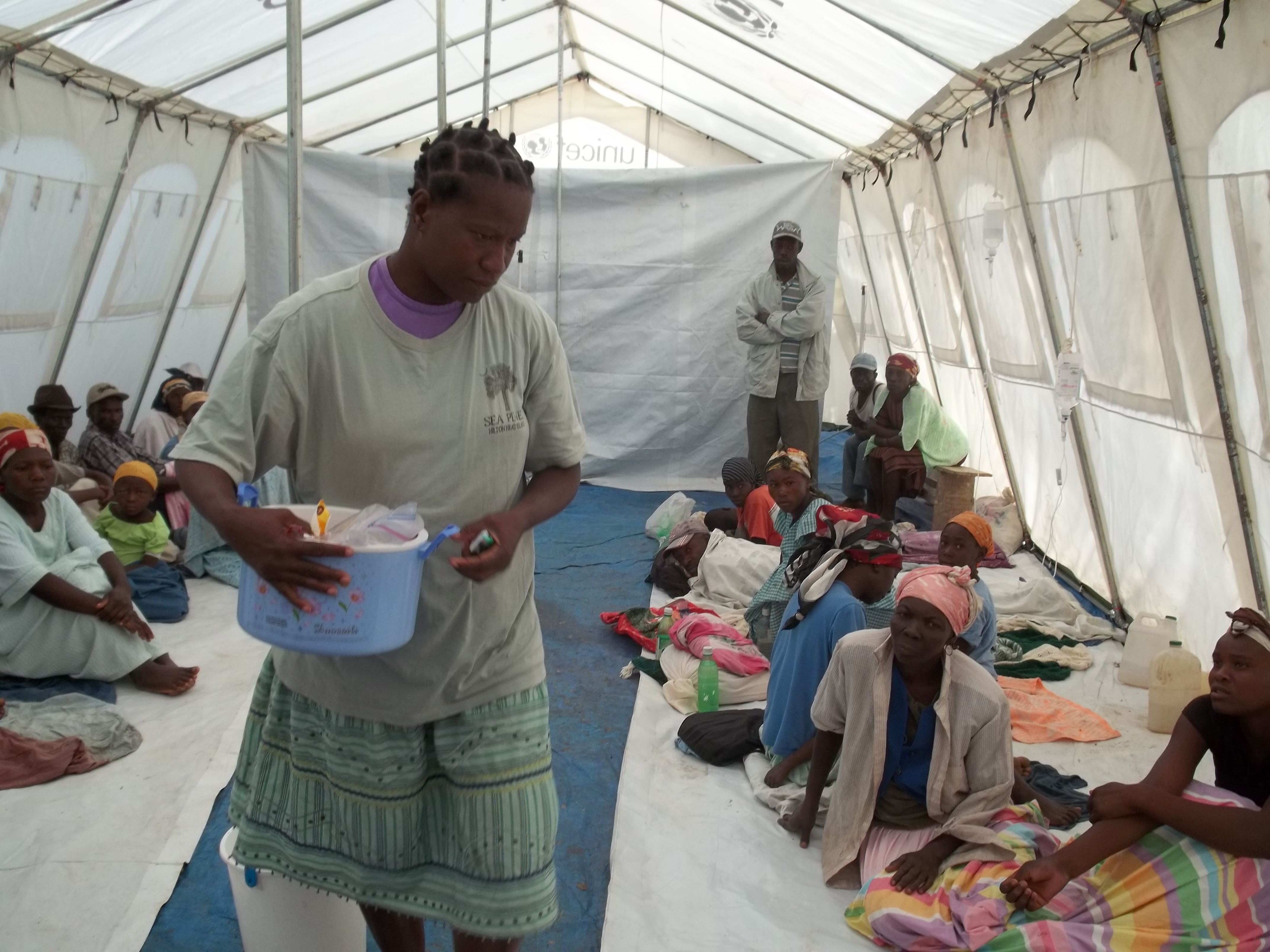 Yvrose passing out hygiene items to cholera patients