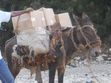 To rightly appreciate the situation I need to describe the Haitian pack rig.  You start with a pad made from banana leaves, then comes a nailed together wooden packsaddle “of sorts” tied on with a small cord (looks more like string to me) made of some local natural fiber. Over this go big panniers made of some kind of reed.  Now, on top of this rig strapped to a Haitian mountain mule, filled with all sorts of things, the passenger, namely me, is feeling none too certain of his control over the situation.