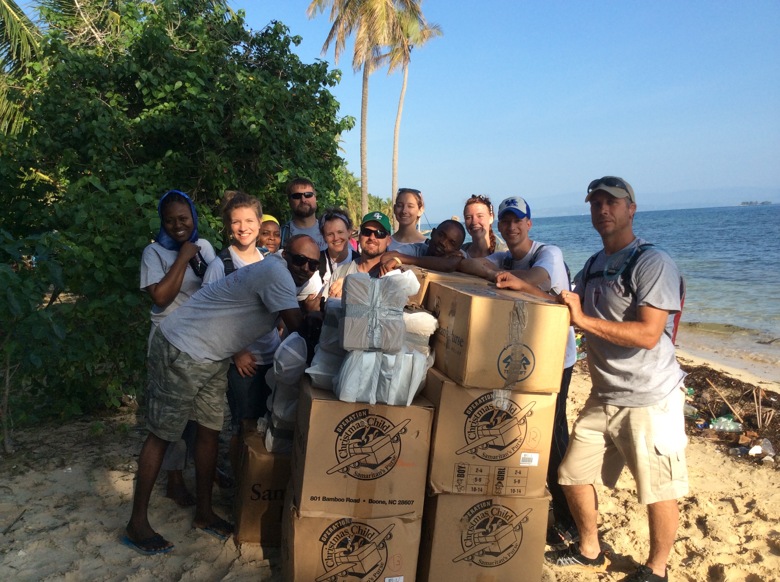 The Kentucky team and translators on the beach with Operation Christmas Child boxes