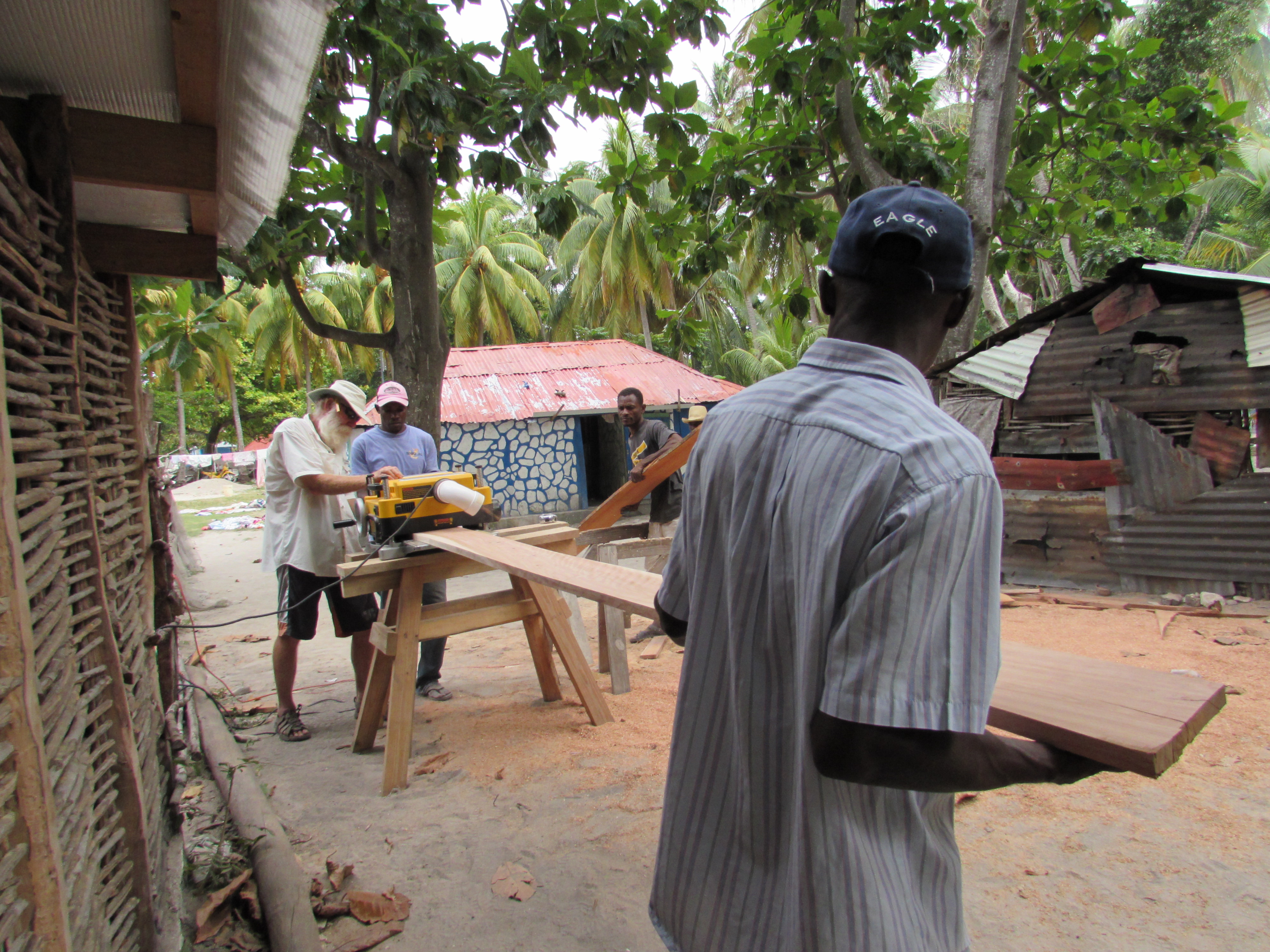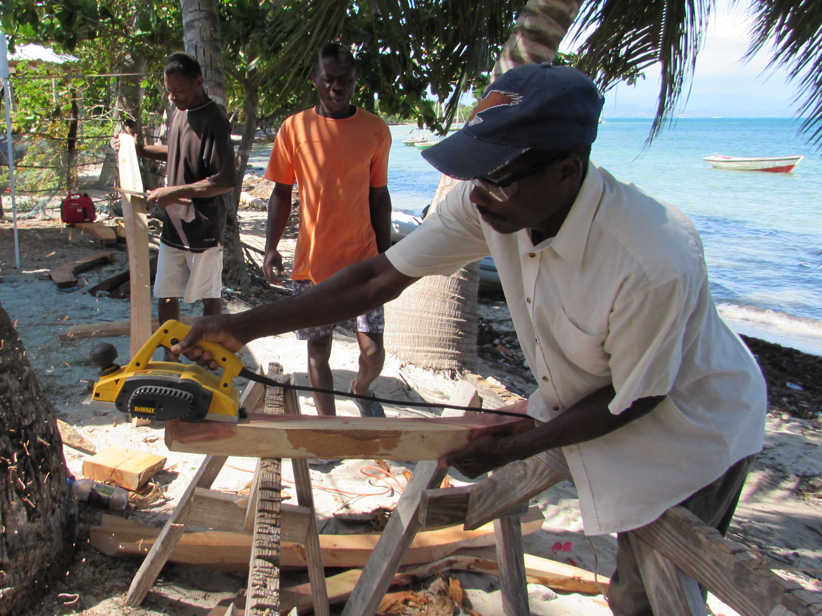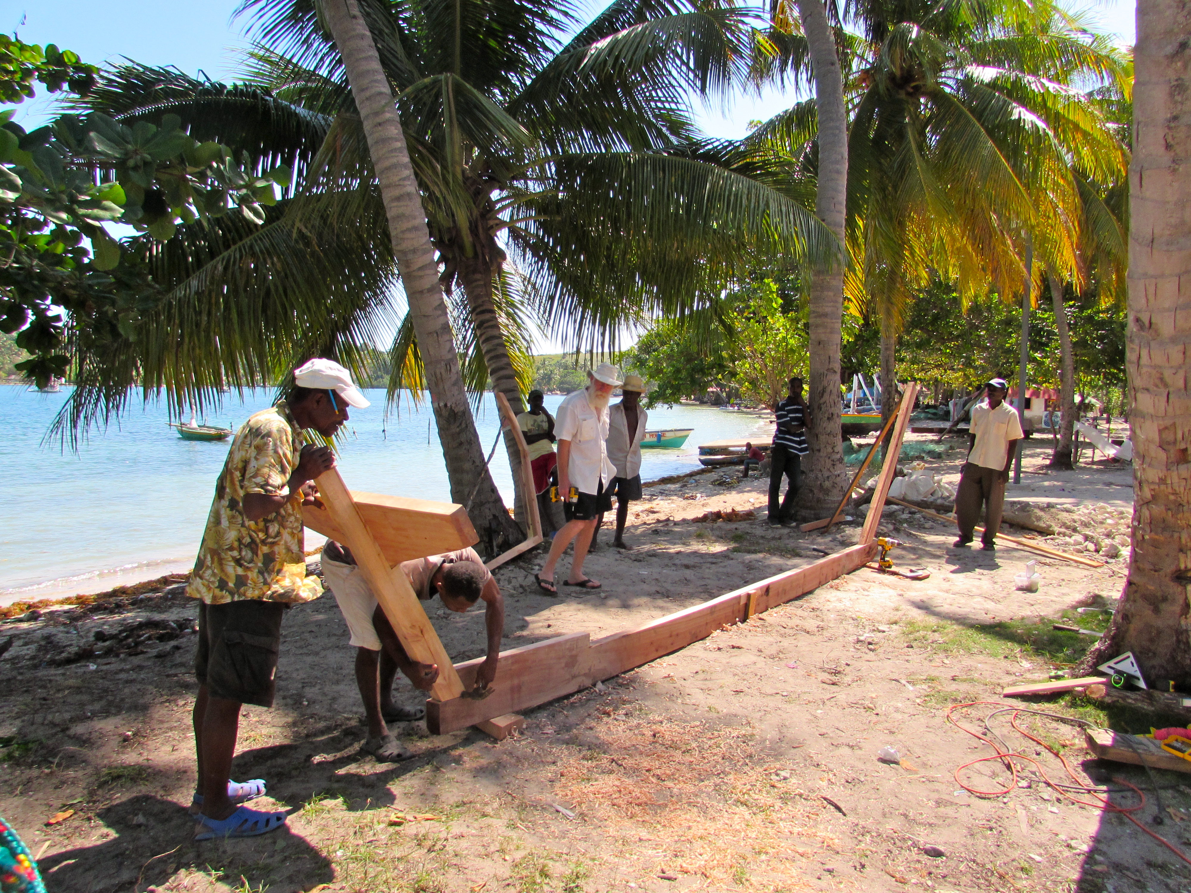 The wooden sailboat is being built by Haitian boat builders here on the island. Brothers Mssrs. Obli and Ashlomme and Bill are building it. Their father was a wooden boat builder as his father was before him. Mssrs. Yvon, Sonet, and sometimes Jureau are helping them. They are teaching Bill how to build the boat and he is teaching them how to do finer woodworking on it and providing employment for the men which is so desperately needed on the island.