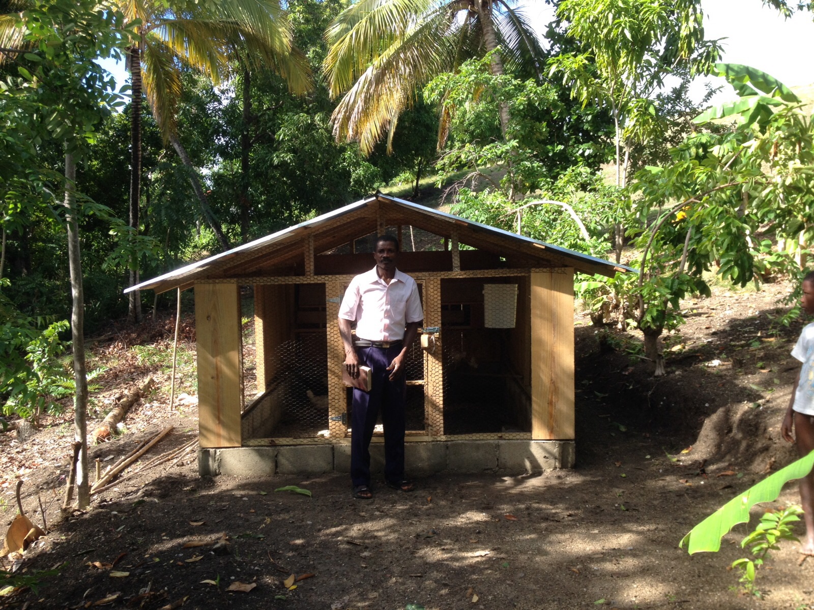 The basic frame of the chicken house was built at the base and carried up the hill to be assembled at the site. We had brought plastic covered poultry wire into Haiti in our luggage as rusting wire is a big problem. It is probably the neatest strongest little chicken house in the country! We put it at M. Yvon’s house above Kakok. It will be exciting to see how this works out for them and we may learn some things before building the next one. Our thanks to Fairview Christian for making this possible!